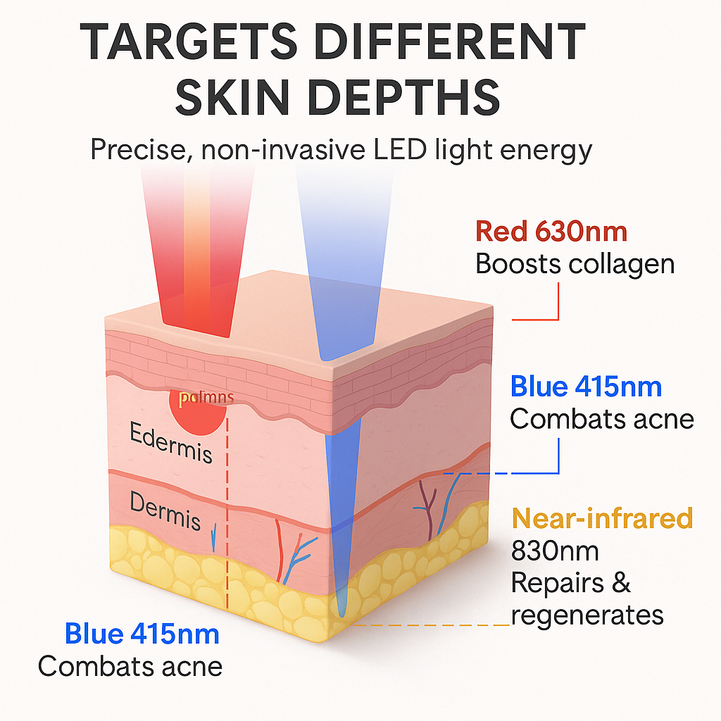Each wavelength is optimized for skin rejuvenation, acne care, or collagen stimulation.